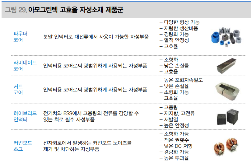 · 고효율 자성소재 : 전력변환시(ex, AC to DC) 전력손실 최소화 > 고전력 EV, ESS, 태양광 인버터 등에 적용
