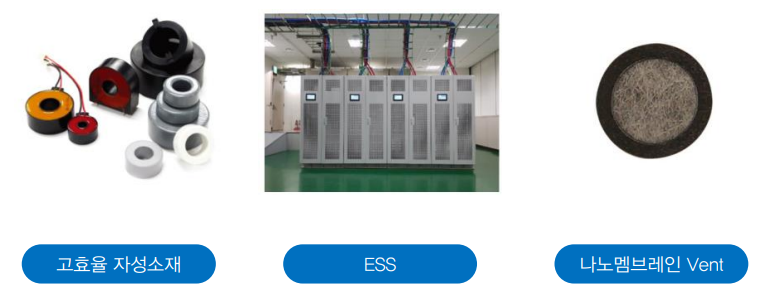 아모그린텍은 크게 3가지 사업을 하고 있는데요. '고효율 자성소재', '나노 멤브레인', 'ESS' 이 세가지를 판매하고 있어요. 고효율 자성소재란 전력변환시 발생하는 전력손실을 줄여주는 역할을 해주고요. 나노 멤브레인은 나노섬유로 촘촘하게 박막을 형성하여 물 같이 큰 분자들은 막아내고 음파, 공기 등은 통하게해 방수기능+열 방출까지 함께 하는 소재입니다. ESS는 신재생에너지 등에서 만든 전기를 저장하는 장치이죠.