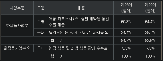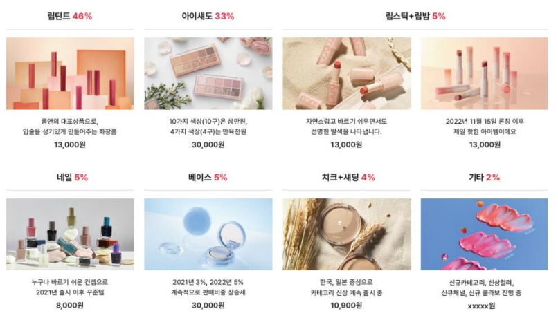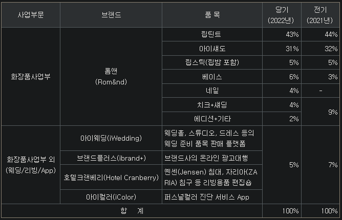 · 화장품(95%) : 롬앤(Rom&nd, 색조화장품 위주) > 립틴트(43%), 아이섀도(31%), 립스틱(5%), 베이스(6%), 네일(4%), 섀딩(4%), 에디션(2%)