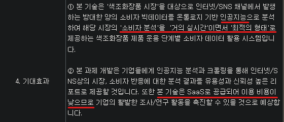 아이패밀리에스씨는 국책과제로 인터넷상에서 떠도는 잠재 소비자들의 정보를 인공지능으로 실시간 분석하여 제품양산까지 바로 이어질 수 있는 R&D투자를 한 것으로 보입니다. 예전에 빅데이터 취합이 불가능했을 때는 사람들에게 직접 설문조사 하거나 판매 개수를 보고 판단을 했어야했죠. 다만, 설문조사는 주관적이고 그때 그 상황에 따라 답변이 제각각이라 신뢰할만하지 못했어요. 그러나, 익명성을 전제로 검색창이나 자신의 블로그에는 솔직한 데이터가 남기 때문에 이를 실시간으로 분석한다면 시장 트랜드를 빨리 따라갈 수 있게 되었죠. 이렇게 실시간 소비자트랜드 분석툴을 Saas(Software as as a Serviece) 형태로 판매하는 연구실적입니다.