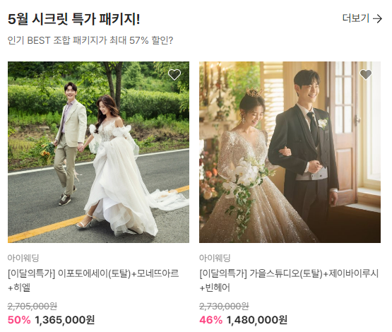 대부분의 사람들이 일생동안 결혼을 1~2번 밖에 하지 않기 때문에 결혼식에 대한 정보가 부족하죠. 그래서, 웨딩시장은 정보의 비대칭성이 강력합니다. 전문 웨딩플래너에 의존할 수 밖에 없는 구조인 것이죠. 아이패밀리에스씨는 웨딩플래너에게 있는 웨딩주도권을 소비자들에게 넘기려는 사업을 하고 있어요. 쿠팡, 네이버쇼핑 처럼 마치 온라인쇼핑하듯이 '아이웨딩APP'에 들어가면 소비자가 선택을 할 수 있어요. 아래 이미지는 실제 APP이미지이며 카테고리 클릭 후 들어가면 얼마나 할인을 받고 어떤 패키지가 들어가 있는지를 보여줍니다.