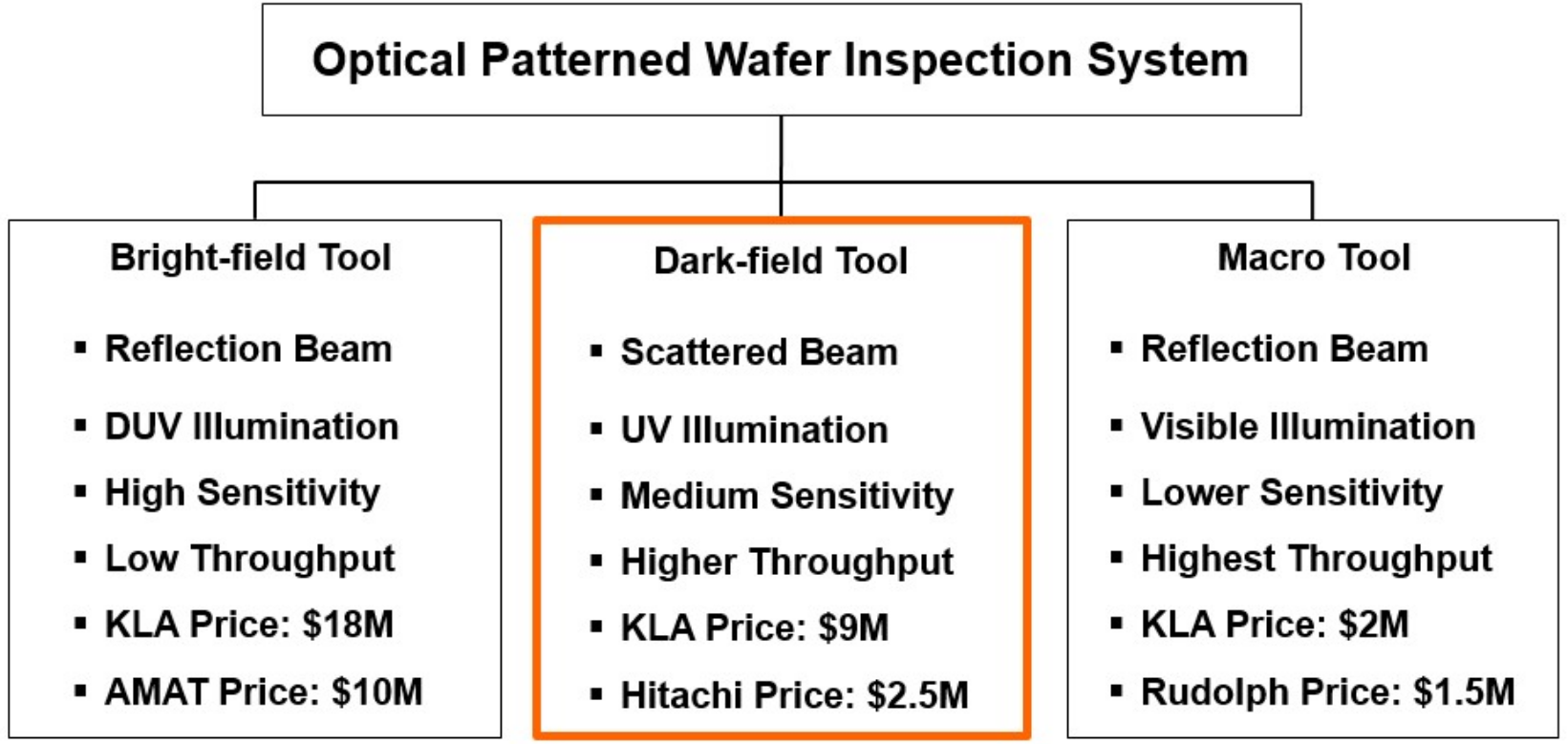 · 광학검사장비(Optical Inspection System, 전공정용 패턴결함검사) : Dark-field(산란광검사장비, UV광원이용=30nm검사가능), Bright-field(반사광검사장비, DUV광원이용=15nm검사가능) / 중국의존도 62% / 국내, 이스라엘(첩보위성보유>이미지프로세싱전문) R&D센