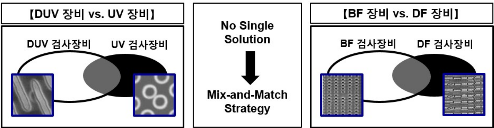 광원을 DUV를 이용하면 반사광검사장비, UV를 이용하면 산란광검사장비로 나뉩니다. 반사광검사장비는 속도는 느리지만, 더 높은 해상도를 얻을 수 있어요. 산란광검사장비는 덜 선명한 검사이지만, 더 빠른 속도로 검사가 가능합니다.