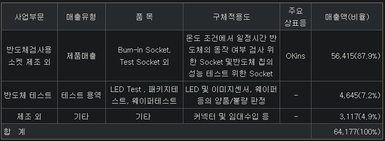오킨스전자는 번인소켓을 판매하는 업체인데요. 번인소켓(Burn-In Socket)은 반도체가 출하되기 전에 실생활에 노출되는 온도보다 더 가혹한 환경을 가해서 테스트를 진행하는데 여기에 쓰이는 소켓인 것이죠. 예를 들면, PC용 반도체는 온도가 100도 이상 올라가지는 않지만 번인테스트에서는 125도 정도로 테스트를 해보는 것이죠. 여기서 통과를 하면, 일상생활에서 반도체가 열 때문에 손상입을 일은 적을테니깐요. 또한, 칩의 데이터를 쓰고 지우며 동작여부도 같이 해요. 이때, 칩을 담을 그릇이 필요한데 이를 번인소켓(Burn-In Socket)이라 부릅니다. 오킨스전자는 이러한 번인소켓을 반도체검사용 보드(Board)업체에 주로 판매를 하고 있어요. 보드 위에 소켓이 올라가기 때문이죠.