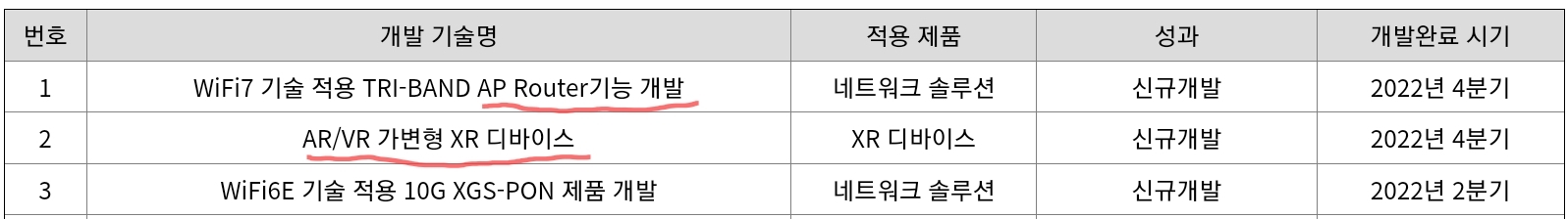 가온그룹은 가장 최근에 네트워크장비 R&D에 집중한 것을 알 수가 있는데요. AP Router에 WiFi7 기술을 접목한 것을 알 수 있어요. AP는 Access Point의 약자로 유선LAN을 무선망으로 길(Router)을 터주는 역할을 하죠. 자회사 케이퓨처테크를 통한 XR 디바이스도 계속 연구개발 하는 것을 확인할 수 있어요.