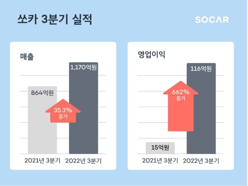 쏘카가 22년 3분기 실적발표를 했죠. 전년 동기 대비 매출액 35.3% 증가, 영업이익 662% 증가입니다. 아주 선방한 실적이죠.