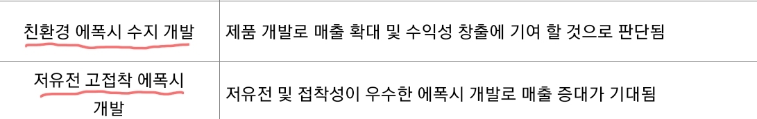에폭시도 석유화학제품이기 때문에 탄소배출에서 자유롭지 않은데요. 친환경 에폭시 R&D를 진행 중인 것으로 보여요. 그 바로 아래 R&D는 '저유전 고접착 에폭시'인데요. 저유전은 유전율이 낮다는 뜻이죠. Low-k라고 반도체소재에서 많이 들어봤을거에요('high-k, low-k 3분만에 정리'). 접착제, 코팅제로 쓰이는 에폭시에 전기가 잘 통하면 안되겠죠. 자칫, 차량 외부 손 한 번 댔다가 강한 정전기로 충격이 올 수도 있으니깐 말이죠. 그래서, 도료 등을 만들 때는 저유전을 기반으로하여 만드는 것을 볼 수 있습니다.