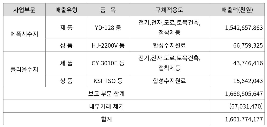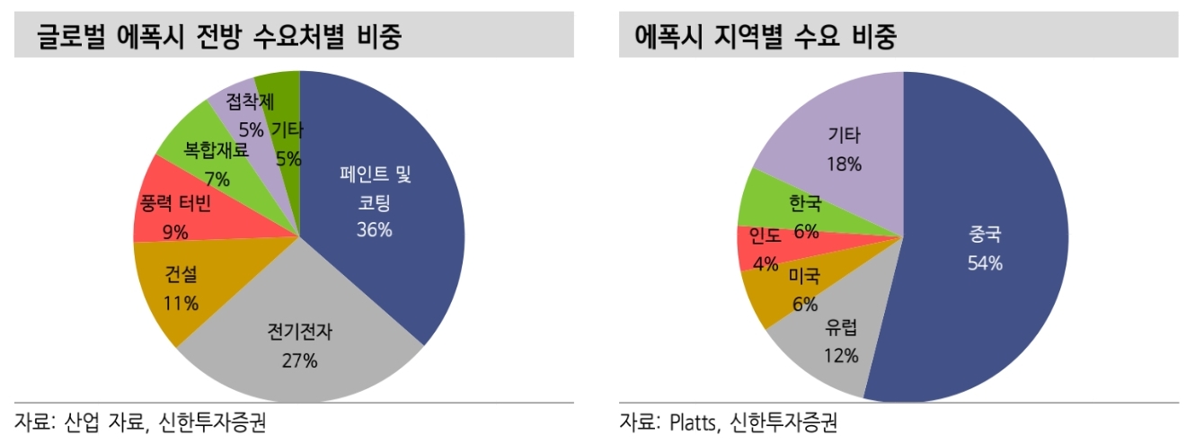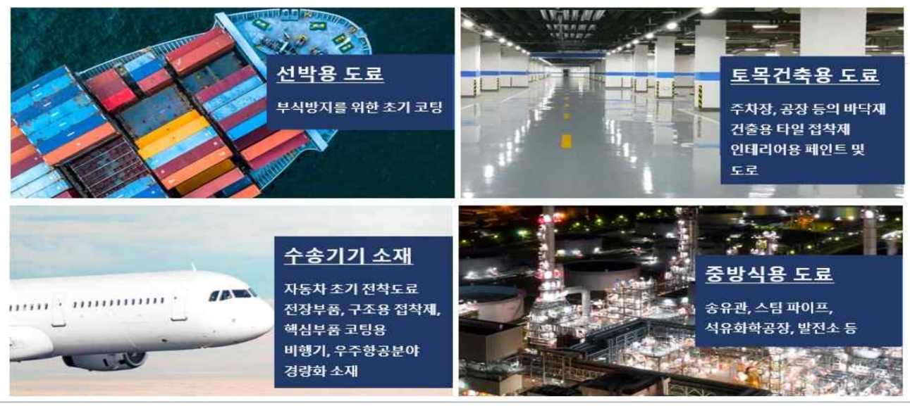 · 에폭시수지(Epoxy) : 도료, 선박, 자동차, 전자제품(ABS), 풍력 터빈 등