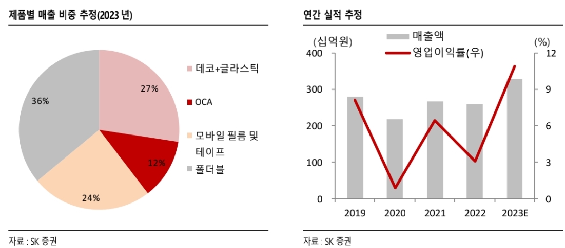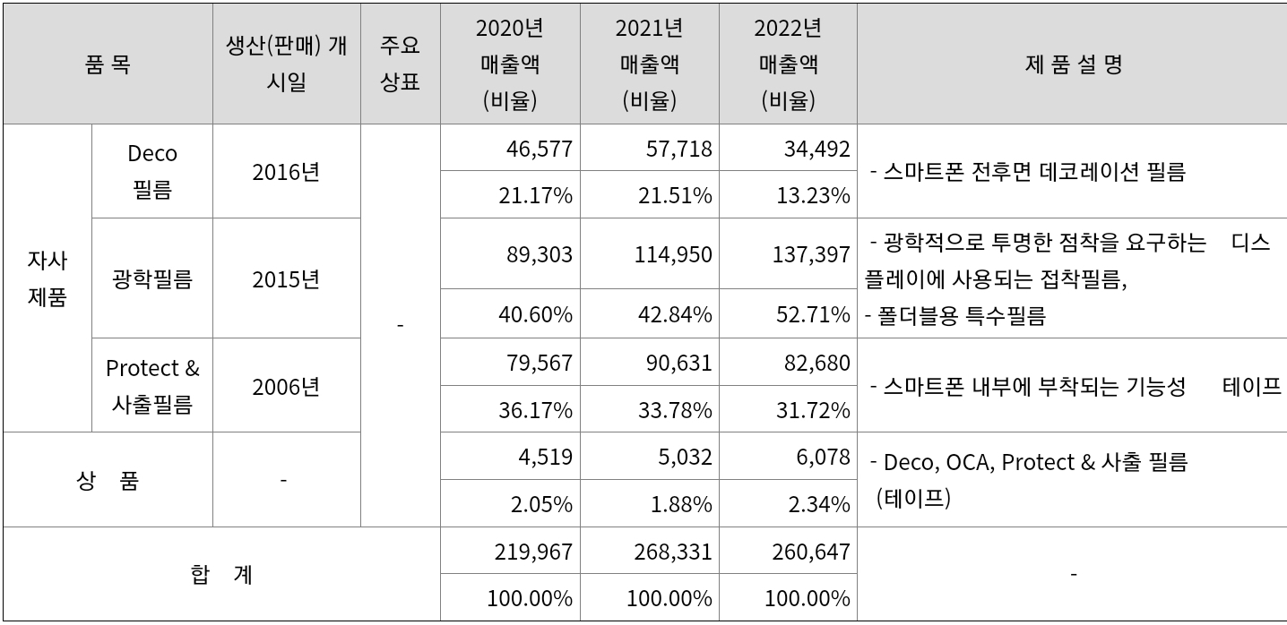 광학필름(53%, OCA=Optical Clear Adhesive/ Foldable Film), Potect&사출필름(32%, 스마트폰 보호용필름), Deco필름(13%, 뒷면 로고, 패턴, 케이스 등)