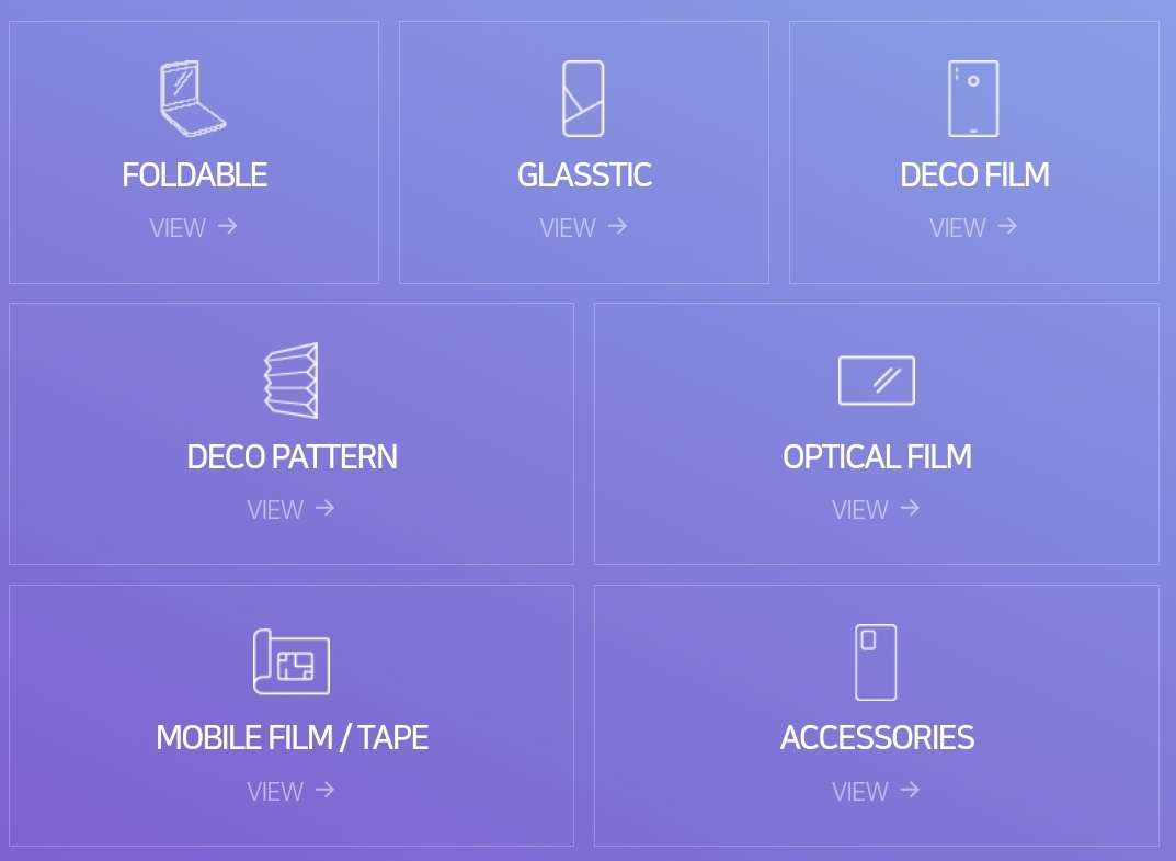 · 스마트폰 필름 : Deco Film(스마트폰 후면 데코, 그라데이션, 패턴, 로고 등), PCPMMA(글라스틱, 스마트폰 후면 케이스), 폴더블 필름(Foldable Film)