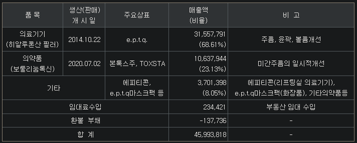 히알루론산 필러(69%), 보툴리눔 톡신(23%), 기타(8%, 리프팅 실, 마스크팩, 임대 등)