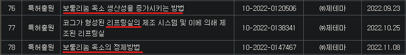 앞서 설명했듯, 제테마는 유럽 소재 국립기관으로부터 보툴리눔 균주를 사온다고 했죠. 사와서 바로 보톡스로 만들 수 있는 것은 아니에요. 가공과정을 거쳐야하죠. 그래서, 동사의 특허를 보면, 보툴리눔의 생산성, 정제 관련한 R&D 흔적이 있는 것을 확인할 수 있어요.