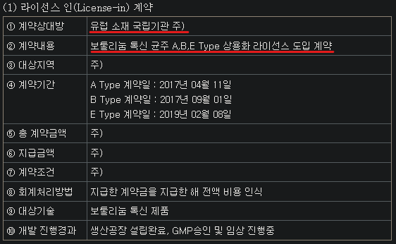 근육세포를 마비시켜야하니, 독성이 있는 균이 필요한데요. 이를 보툴리눔 톡신이라고 불러요. 제테마는 유럽의 국립기관으로부터 사와서 고농도의 균주를 생산하는 기술개발을 완료했죠. 이미 수출용으로는 판매허가가 떨어져 매출액이 찍히고 있고, 국내는 3상 진행 중에 있습니다(23.07.19일 기준). 아래 표는 제테마가 유럽 소재 국립기관과 보툴리눔 톡신 균주를 수입하는 라이센스 내용입니다.
