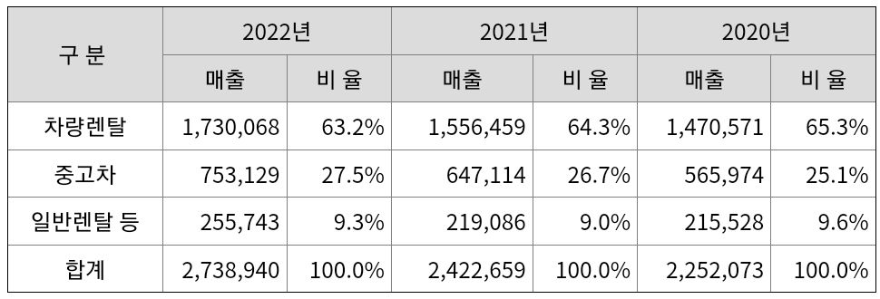 차량렌탈(63%), 중고차매각(28%), 일반렌탈(9%, OA장비=컴퓨터, 프린터etc, 건설장비=지게차,리프트, 통신계측장비, 중소전자기기)