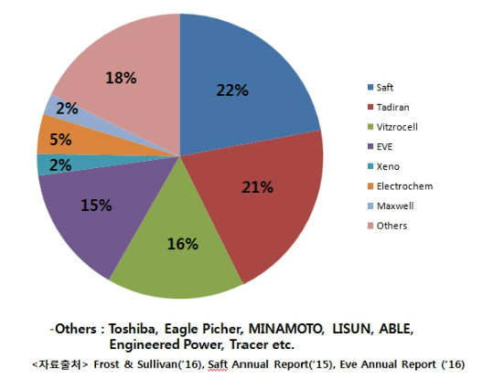 Li-SOCl₂ 글로벌 점유율 : 비츠로셀은 3위(초록색 부분)