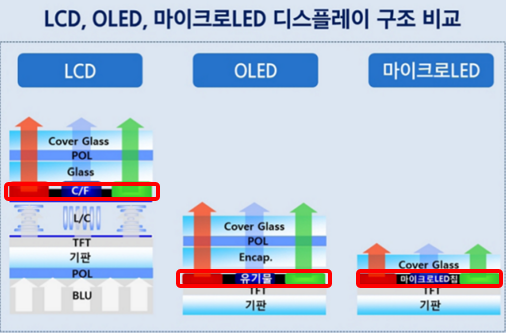 반대로, OLED는 스스로 빛도 내고 컬러도 품고 있기 때문에 백라이트가 필요없는데요. 그래서, 두께가 더 얇죠. OLED에서도 Color Paste가 유기물 속에 들어가 RGB 색감을 내는데 돕습니다.