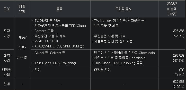 전자사업(53%, 전장향=무선충전기, 차량용계기판, SVM&ADAS카메라, PBA, FPD유리가공, 터치패널), 화학사업(47%, Solvent=용매 > 공업용(농약, 페인트, PVC안정제 등), 전자용(PR, Color Filter, Stripper, Thinner) / TV향 PBA 국내 1위
