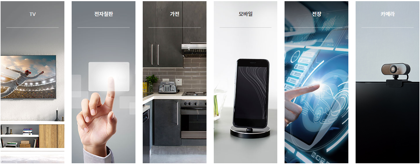 · 전자부품사업 : 전장향(무선충전기, 차량용 계기판, ADAS용 카메라모듈, V2X), 전자제품(PBA), 디스플레이(Glass 가공, 전자칠판&키오스크 터치패널),