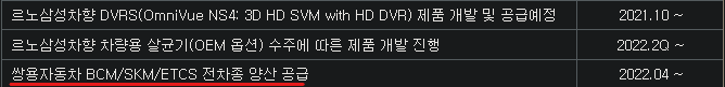 켐트로닉스가 ADAS 사업에 투자하고 있다는 것은 R&D로 확인이 가능한데요. 실제로 실적도 찍히고 있어요. 주로, 동사는 르노자동차(전 르노삼성), 쌍용자동차에 전장향 부품을 납품을 하고 있는데요. 빨간색으로 밑줄 친 부분을 봐볼까요. BCM은 Body Contorl Module입니다. SKM은 Smart Key Module이죠. 그리고, ETCS는 Electronic Toll Collection System을 의미해요.