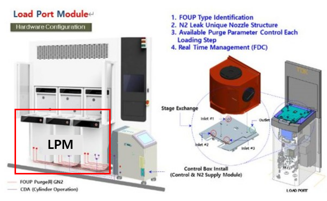 LPM이라는 이름에서도 알 수 있듯이 Load Port입니다. 즉, 물건을 이송(Load)하기 위한 항구(Port)인 것이죠. 반도체 웨이퍼를 저장하는 장비를 FOUP(Front Opening Universal Pod)라고 하는데요. FOUP의 문(Door)를 담당한다고 생각하면 돼요. 중요한건 열고 닫을 때, 산소나 불순물이 올 수 있음으로 여기서 질소(N2)를 적극적으로 사용합니다.
