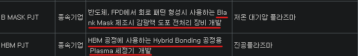 N2 Purge장비( , LPM=웨이퍼저장장치 문역할, CFB=식각후 잔여가스 제거, BIP=웨이퍼저장장치 습도&청정도제어) / 신사업 ; HBM 플라즈마 세정기, Blank Mask 감광액 도포장비