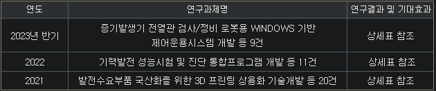 개인적으로 한전KPS의 연구실적과 연구계획을 보면 동사의 현 상황과 미래 비전이 보인다고 생각을 하는데요. 같이 몇 개만 살펴볼까요.