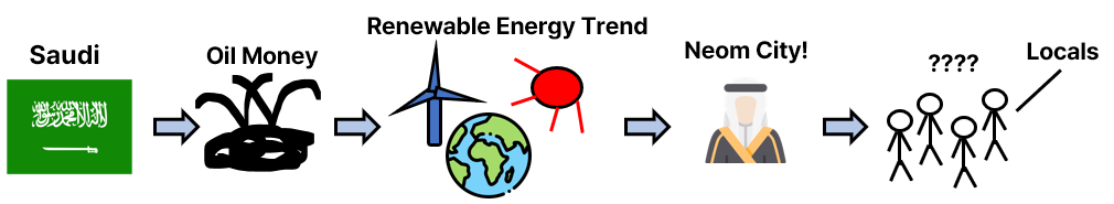 But, here's the thing, even though they're building Neom and it looks great on paper, I'm kinda worried about what's gonna happen without some concrete projects. I mean, who's gonna live there? only a few locals could afford the cost of living in Neom. It's not like everyone in Saudi is living it up with oil money - that's mostly for the government. The regular folks just get some help from the government.