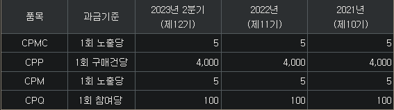 엔비티도 다른 여타 광고업체들과 같이 어느 정도 단가가 정해진 규칙대로 수익화를 실현하고 있는데요. 아래 표를 보면, CPP(Cost Per Purchase)가 가장 높은 단가(4,000원)을 형성하고 있는 것을 알 수 있어요. 그도 그럴 것이, 광고도 잘했고 실제로 소비자가 돈을 꺼내들었으니 광고주 입장에서는 가장 만족할 만한 결과물이기 때문이죠.
