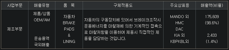 브레이크 마찰재(99%, Pad, Lining), 기타(1%, 운송용역) / 브레이크 패드 국내MS 2위(19%)