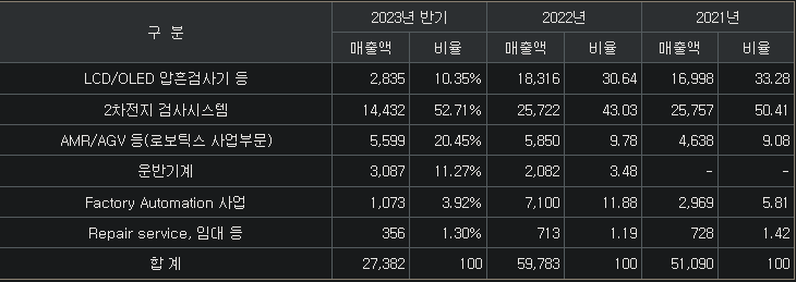 2차전지검사장(53%, AOI), 물류로봇(20%, AGV, AMR), 디스플레이검사장비(11%, 압흔검사기=패널 위 IC, FPC 상태검사 / OLED Lamination=패널 위 편광필름 부착)