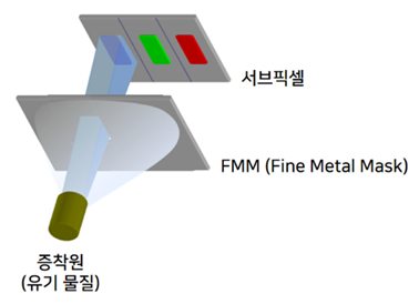 * FMM(Fine Metal Mask) : 유기물 증착시 필요한 금속판 > 미세한 구멍이 있어 증착공정에서 유기물들이 통과