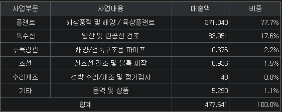 해양(육상)플랜트(78%, 하부구조물=자켓 위주), 특수선(18%, 함정, 관공선=해양경찰선), 후육강관(2%, 두꺼운 강관)