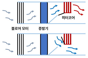 에이치백(HVAC)이라 불리는 HVAC는 열(Heating), 환기(Ventilation), 에어컨(Air Conditioning)을 관리하는 것을의미해요.쉽게 생각하면, 차량이 움직이면서 쓰는 유체(기체, 액체)의 기능들을 통합관리한다고 생각을 하면 됩니다. 아래 그림을 봐볼까요. '간단한 공식 = 모터(외부 바람 끌어옴) > 증발기(압축하여 밀도UP) > 히터코어 통과(히터기능 시) or 피해감(쿨링 작용시)'이라고 보면 됩니다.
