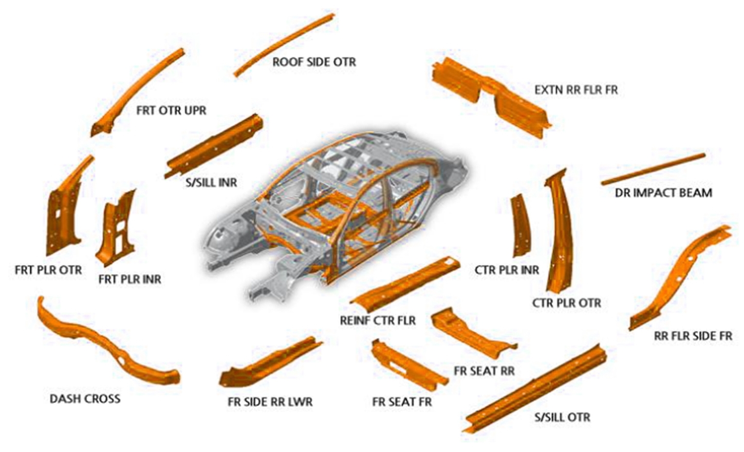 · 차체 핫스템핑(Body Hot Stamping) : 차량 경량화, 생산시간 단축, 공간효율성, 생산비용절감(레이저트림 필요x)