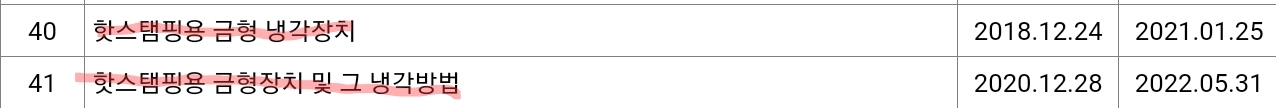 핫스탬핑 공법은 '고온에서 철강 달굼 > 프레스로 찍어누름 > 빠른 냉각'의 공정이라고 했는데요. 동사의 대부분 R&D 및 특허 내역을 보면 핫스탬핑에 필요한 금형장치와 냉각방법이 주를 이루고 있습니다. 그중 가장 최근 특허인 2018~2022년도 내역을 아래에 가져와봤어요.