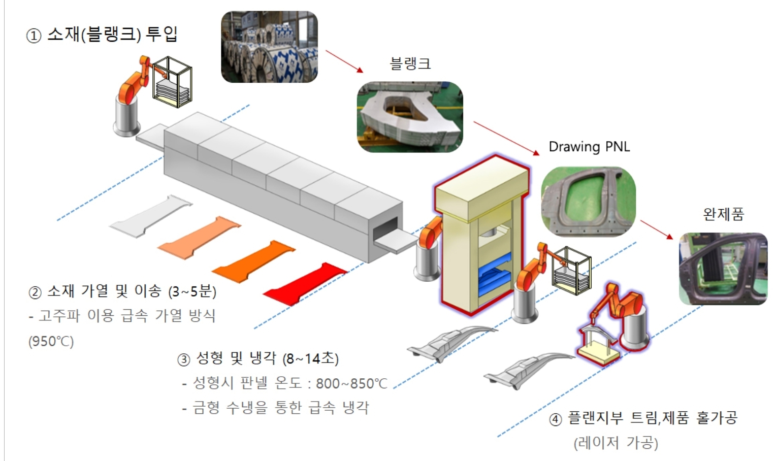 * 핫스탬핑(Hot Stamping) 원리 : 고온 950도 이상(Hot) 철강소재 달굼 > 프레스로 찍어누름(Stamping) > 내구성향상(분자압축), 열변형방지를 위한 빠른 냉각 > 완성