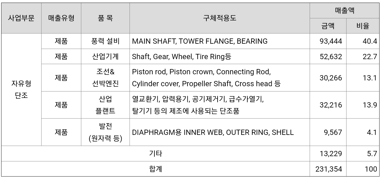 자유형+형단조(100%, 풍력(4),산업기계(2),조선(1.3),플랜트(1.4),원자력발전(0.4))
