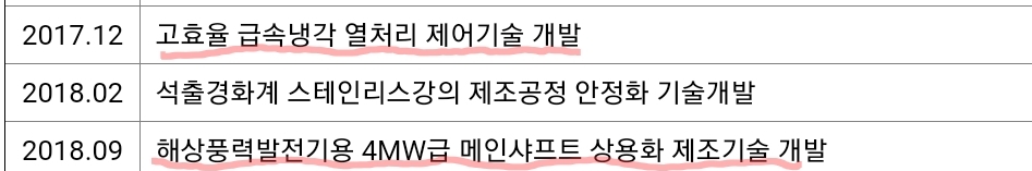 단조는 철강을 갖고 '가열>압축>압착'의 과정이라고 했죠. 금속을 가열하면, 유연한 상태가 되는데요. 이때, 재빠르게 냉각을 시켜줘야 제자리에 있어야할 분자들이 딱 그자리에 있게 되요. 그래서, 아래 R&D 실적을 보면, 고효율 급속냉각 제어기술에 투자한 것을 확인할 수 있죠.