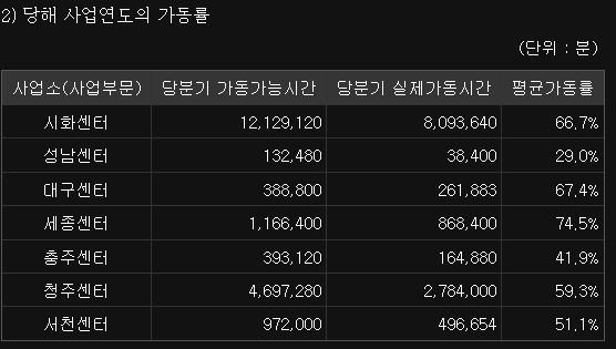 여러 지역에 센터가 있는데, 베이커리, 식품 부분 사업공장을 모두 합친 것입니다. 위 가동률 평균치를 내니까 55.7%가 나오더라구요. 그러니까 1억원 만들 수 있는 능력있음에도 5570만원 정도 만들어내고 있다는거에요. 특히, 베이커리부분 센터가 시화, 성남센터인데 빵은 유통기한이 짧음으로 정말 수요에 기반해서 만들어내야 재고손실을 보지않겠죠. 좀 더 정확한 가동률이라 할 수 있을 것 같은데 두 개 평균가동률은 44.7%입니다.