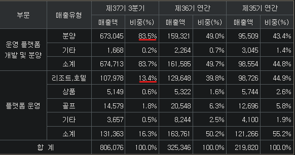 *유동적 / 호텔&리조트분양(84%), 호텔&리조트운영(14%)