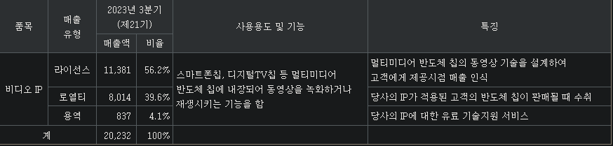 비디오IP 라이센스(56%, 기술이용료), 로열티(40%, 완성품 판매수수료), 용역(4%) / 잠재시장 : 디스플레이, 전장카메라, 보안, 데이터센터, 메타버스