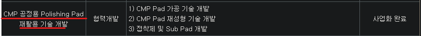반도체 HBM 공정에서 CMP는 필수적이라고 했죠. 특히, 이제 아파트 처럼 고층화된 메모리칩을 쌓으려면, CMP 공정의 1칩당 들어가는 시간도 증가하게 되었는데요. 그러면, 자연스레 부품인 CMP Pad가 금방 마모가 되겠죠. 더 오랜 시간 사용을 하니깐요. 아래 에프엔에스테크의 R&D를 보면, CMP Pad를 재활용할 수 있는 기술을 사업화한 것을 알 수 있어요. CMP Pad를 계속 고객사가 주문을 넣어주면, 고맙겠지만 고객사도 비용을 생각해야하고 경쟁사들도 이러한 틈새를 노릴 것이에요. 그래서, 동사의 CMP Pad는 재활용하며 오랜 기간 사용할 수 있다는 것을 경쟁력으로 밀고 있는 것 같습니다.