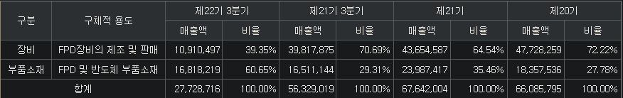 *매출유동적 / 디스플레이장비(40%), 반도체&FPD부품(60%, UV Lamp, Metal Mask 세정장비, CMP Pad)