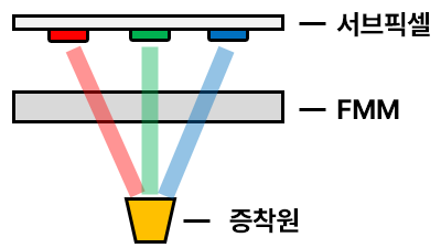 * FMM : 얇은 금속판에 촘촘한 구멍 > 유기물들이 구멍을 통해 픽셀에 증착