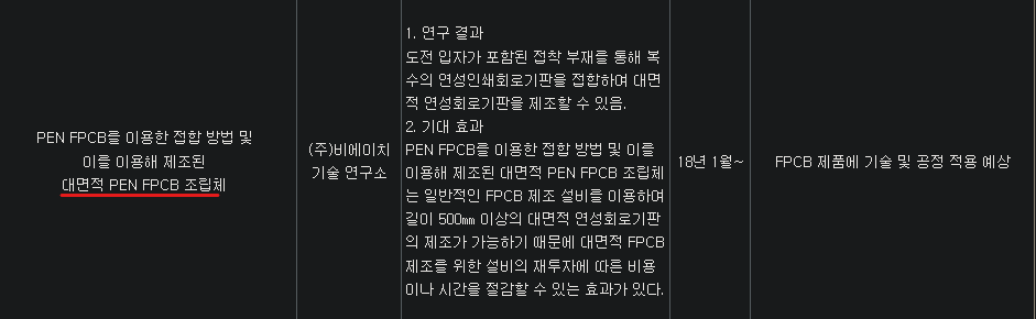점차, OLED TV가 대중화가 되기 시작했죠. TV만 보더라도 80인치가 넘고 있죠. OLED TV에는 FPCB가 필수적으로 들어가는데요. 디스플레이가 커진 만큼 FPCB도 커져야합니다. 다만, FPCB 제조산업은 장치산업이기에 기존 기계를 바꿔야하는 비용적인 문제가 생겼는데요. 동사는 여러개의 FPCB를 접함하여 대면적으로 만들 수 있는 기술에 R&D 투자한 것으로 보여요. 그럼, 기존 장치들도 그대로 사용하고 신규 대형 디스플레이에도 대응할 수 있기 때문에 훌륭한 전략입니다.