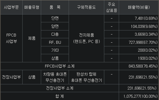 FPCB(79%), 차량용 스마트폰무선충전기(21%) / 주요 거래처 : SDC > 애플 OLED 채택(아이폰, 아이패드, 맥북 등) 수혜