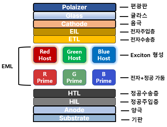 선익시스템은 OLED증착장비를 납품하는 업체에요. OLED는 Organic Light-Emitting Diode의 약자인데요. 말 그대로, 유기(Organic)발광(Light-Emitting)소자(Diode)라고 이해하면 되요. 스스로 빛을 내기에 LCD 처럼 뒤에 백라이트가 없어서 두꼐를 얇게 만들 수 있죠. 동사는 유기물발광층에 들어가는 HIL, HTL, EML, ETL, EIL를 증착하는 장비를 납품합니다. 아래 그림을 보면 더 이해하기 쉬운데요. 빛은 +극과 -음극이 서로 만나야지만 그 효과가 있어요. +극(Anode)에는 HIL(Hole Injection Layer), HTL(Hole Transporting Layer)가 있고요. -극(Cathode)에는 EIL(Electron Injection Layer), ETL(Electron Transporting Layer)가 있어요. 정공, 전자가 EML(Emission Materials Layer, 유기발광층)에서 만나 빛을 내뿜게 되는 것이죠.