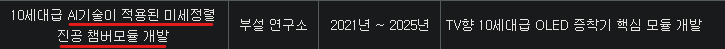 선익시스템은 OLED증착장비를 생산&판매하는 업체라고 했죠. 증착에서 가장 중요한 것은 정확히 올리는 것입니다. 규격에 맞게 정확히 올리는 것이 중요하기에 비틀어지면 안되죠. 아래 R&D를 보면, AI기술을 적용하여 미세정령 기술을 구현하기 위해 연구하고 있는 것을 알 수 있어요. 참고로, 진공챔버란 증착공정 시 최대한 산소 같은 외부물질이 끼면 안되기 때문에 진공상태에서 증착을 진행해요.