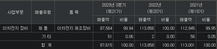 이차전지장비(100%, 노칭&슬리팅-조립-활성화-팩-검사) / 주요거래처 : LGES, SK온, 삼성SDI / 폐배터리 리사이클링 / R&D : 반고체전지용 조립,활성,팩,검사장비