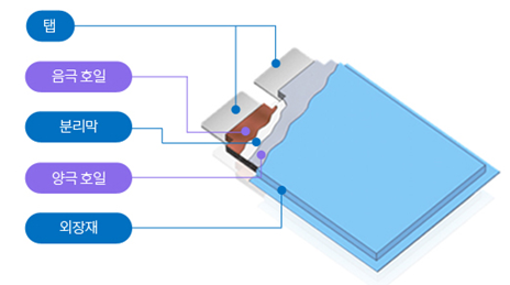 리드탭(조립공정) : 이차전지의 양극과 음극 각각 탭 형성 > 외부전기신호 연결 + 전해액 누수방지>